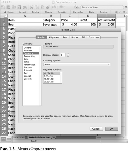 В этом меню вы можете выбрать формат содержимого ячеек столбца Е. В нашем случае нужен денежный формат. Также можно указать число знаков после запятой при округлении. Оставьте 2 знака после запятой, как показано на рис. 1–5. Также в меню «Формат ячеек» доступны такие опции, как цвет шрифта, заливка ячейки, выравнивание текста, границы и т. д.