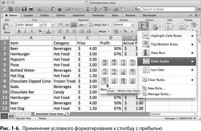 Закройте меню «Формат ячеек» и переместитесь во вкладку «Главная». В разделе «Стили» («Формат» в MacOS) вы найдете «Условное форматирование» (рис. 1–6). При нажатии на него выпадает меню. Самое используемое условное форматирование в этой книге – цветовые шкалы. Выберите шкалу для столбца Е и посмотрите, как изменился цвет каждой ячейки в зависимости от величины значения в ней.