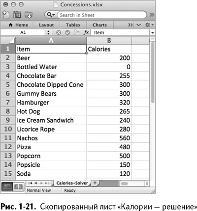 Для начала сделайте копию листа «Calories»/«Калории», назовите его «Калории – решение» и удалите из копии все, кроме таблицы калорийности. Чтобы сделать копию листа в Excel, просто кликните правой клавишей мышки на заголовке листа, который хотите скопировать (внизу), и выберите в появившемся меню «Переместить» или «Копировать». Так вы получите новый лист, как на рис. 1-21.