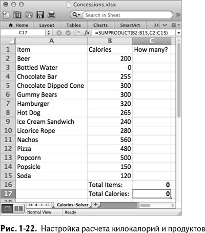 Чтобы добавить условие общего количества килокалорий, нажмите «Добавить» и задайте ячейке С17 значение 2400, как показано на рис. 1-24.