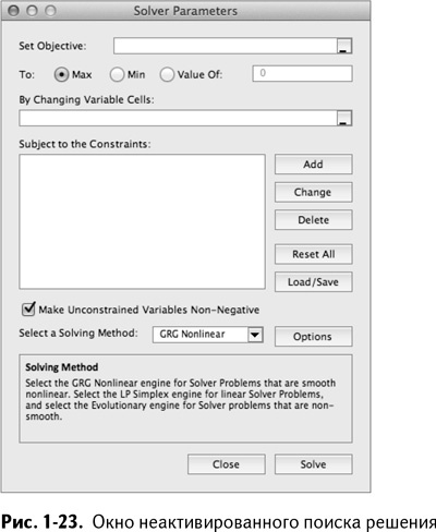 Окно поиска решений в Excel 2011, показанное на рис. 1-23, выглядит примерно так же, как и в Excel 2010 и 2013. В Excel 2007 интерфейс немного другой, но единственное существенное отличие заключается в отсутствии окна выбора алгоритма. Зато можно выбрать «Линейную модель» в параметрах поиска решений. Обо всех этих элементах мы поговорим позже.