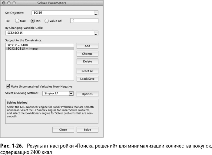 Наша цель – минимизировать количество покупок в ячейке С16. Ячейки, значение которых может меняться, находятся в пределах С2:С15. Условие же состоит в том, что значение С17 – общего количества килокалорий – должно равняться 2400. Также нужно добавить условие, что результат должен быть положительным и целым – мы ведь считаем покупки в штуках, так что придется отметить галочкой опцию «Неотрицательные значения» в меню параметров поиска решения Excel 2007 и добавить целочисленность как условие решения. Так или иначе, мы не можем купить 1,7 бутылок газировки. (Всю глубину условия целочисленности вы познаете в главе 4).