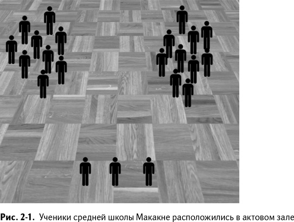 Герои нашего примера – ученики средней школы Макакне, пришедшие на танцевальный вечер под романтическим названием «Бал на дне морском», – рассеяны по актовому залу, как показано на рис. 2–1. Я даже подрисовал в Photoshop паркет, чтобы было легче представить ситуацию.