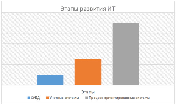 Исходной точкой типологии являются первые ИТ, которые строились на основе баз данных (СУБД). Ценность этого этапа формулировалась, как в предыдущем разделе. Казалось, что если сложить данные в единую СУБД и связать их отношениями, то такая система решит все проблемы управления, и наступит счастье. Счастье наступило, но только для некоторых компаний. Например, на этом этапе раскрутились такие гиганты современной индустрии как Oracle и SAP, которые разработали современные реляционные базы данных.