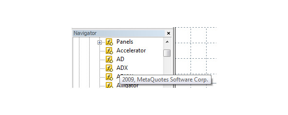 При наведении курсора на название индикатора в окне Navigator терминала всплывает подсказка, отображающая свойство copyright.