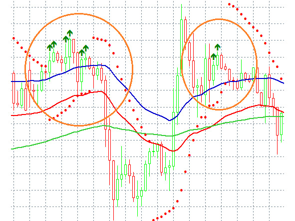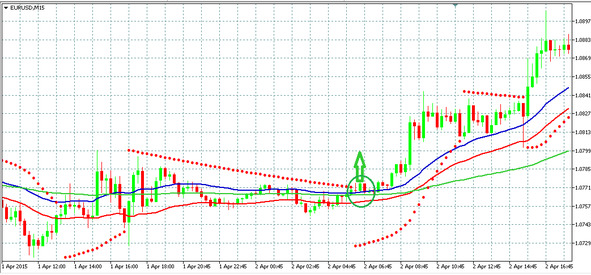 Сигнал на покупку: зеленая свеча закрывается выше EMA34 High и EMA34 Low, зеленая свеча выше EMA125 и Parabolic SAR.
