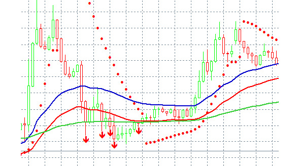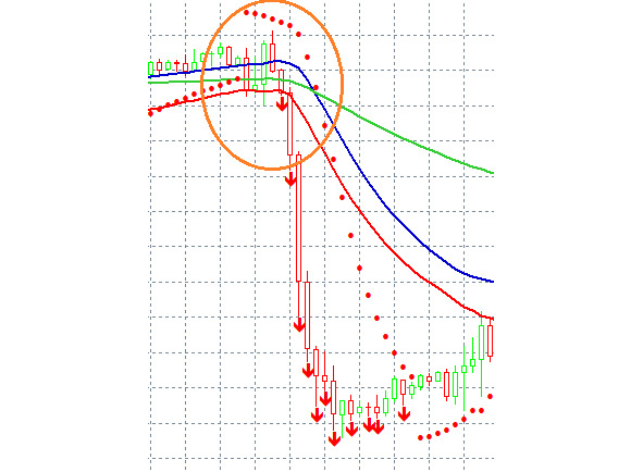 Сигнал на продажу: красная свеча закрывается ниже EMA34 Low и EMA34 High, красная свеча ниже EMA125 и Parabolic SAR.