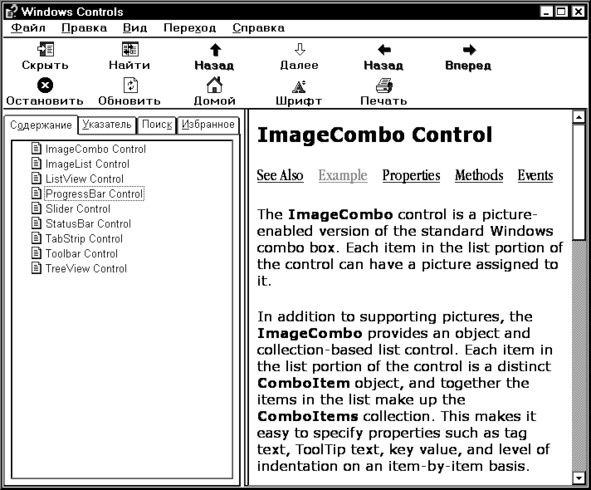 Находясь в окне справочной системы Visual Basic, можно просмотреть содержание других тем, воспользоваться алфавитным указателем или поиском для нахождения требуемого раздела справки.