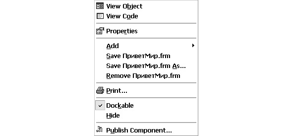 Выберите пункт меню Save ПриветМир.frm (Сохранить ПриветМир.frm) для сохранения формы на диске.