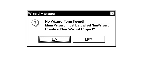 При первом запуске менеджера мастеров должно появится сообщение: No Wizard Form Found! Main Wizard must be called «frmWizard’. Create a New Wizard Project? (Не найдена форма мастера! Главный мастер должен называться frmWizard’. Создать нового мастера?) (Рис.3.29).