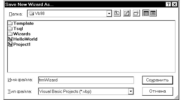 Нажмите кнопку Да (Yes), что приведет к созданию главного мастера VB Wizard Manager (Менеджер мастеров Visual Basic) и открытию диалога Save New Wizard As… (Сохранить нового мастера как…) (Рис.3.30).
