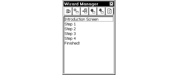 Рассмотрим функции кнопок панели инструментов VB Wizard Manager (Менеджер мастеров Visual Basic), которые позволяют программисту работать со списком последовательно выполняемых действий (шагов), каждому из которых соответствует отдельная форма: