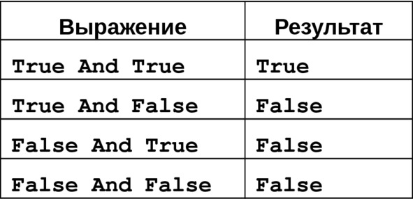 Оператор логического умножения And всегда находится между двумя операндами. Значение всего выражения будет True (Истина), только если оба из них возвращают True (Истина), иначе – False (Ложь) (Рис.4.5).