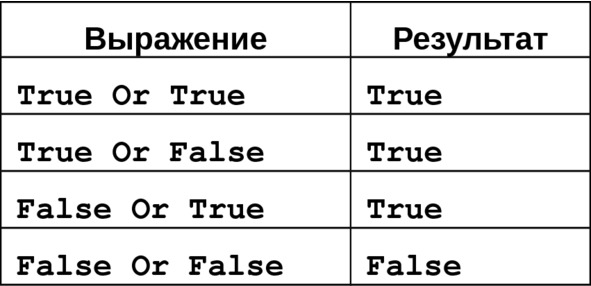 Логическое сложение Or – еще один из наиболее часто встречающихся логических операторов. По написанию он похож на предыдущий и возвращает True (Истина), если хотя бы один из операндов имеет значение True (Истина) (Рис.4.6).