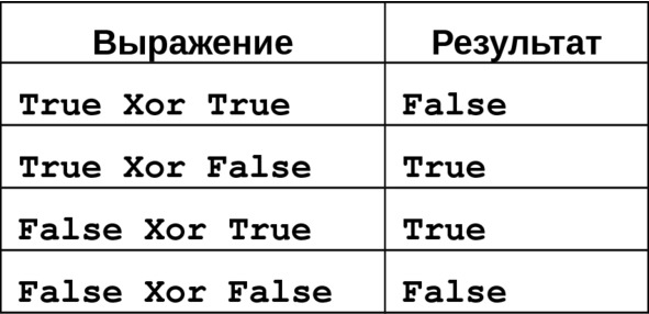 Исключающее сложение Xor работает аналогично Or, кроме случая, когда оба операнда имеют значение True (Истина) (Рис.4.7).