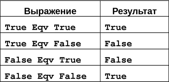 Оператор логической эквивалентности Eqv возвращает True (Истина), если оба операнда имеют одинаковое значение. Иными словами, его результат противоположен использованию оператора исключающего сложения Xor (Рис.4.8).