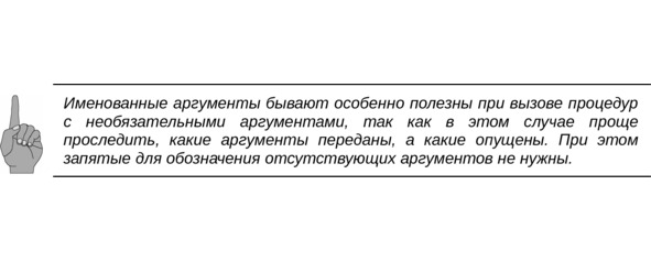 Обычный синтаксис вызова процедур предусматривает позиционную передачу аргументов, то есть в порядке их следования в описании процедуры. Также, возможен вызов процедур с именованными аргументами, которые могут передаваться в любом порядке.
