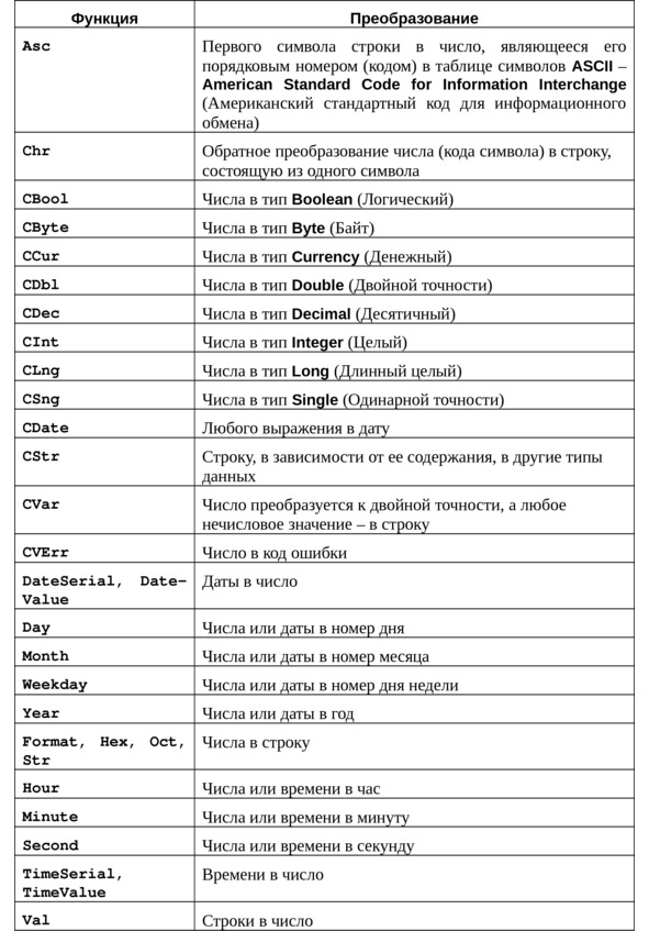 Такое преобразование осуществляется с помощью встроенных функций языка Visual Basic. Допустимы только некоторые виды преобразований, которые перечислены в таблице (Рис.7.2).