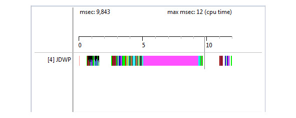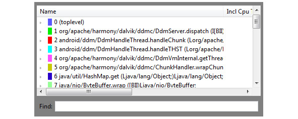 (Start Method Profiling) и (Stop Method Profiling) – запускает и останавливает запись информации о выполнении методов приложения в Trace-файл, который после остановки записи открывается в Traceview-окне, отображающем журнал выполнения в виде двух панелей: Timeline Panel – с помощью цветовой гаммы и шкалы времени описывает старт и остановку выполнения метода в потоке, Profile Panel – показывает детали выполнения методов. В случае Android-устройств версии 2.1 и ранее для создания Trace-файла требуется наличие SD-карты памяти, а также разрешения <uses-permission android:name="android.permission. WRITE_EXTERNAL_STORAGE»/> в файле манифеста AndroidManifest. xml Android-приложения. За отображение окна Traceview отвечает инструмент traceview набора SDK Tools.