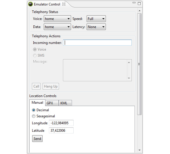 Представление Emulator Control дает возможность имитировать для экземпляра Android-эмулятора входящий звонок, SMS-сообщение и локализацию.