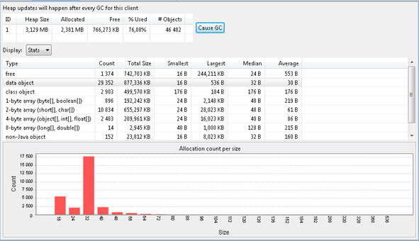 Представление Heap содержит три области. Самая верхняя область показывает таблицу структуры кучи процесса со столбцами ID (идентификатор кучи), Heap Size (общее количество памяти кучи), Allocated (количество занятой памяти кучи), Free (количество свободной памяти кучи), %Used (процент занятости кучи) и #Objects (количество объектов кучи), а также имеет кнопку Cause GC обновления информации о куче.