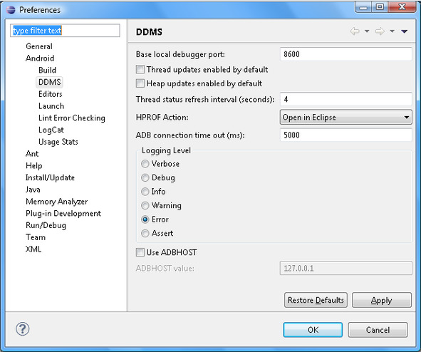 Общая настройка DDMS-инструмента осуществляется с помощью раздела Android | DDMS команды Preferences меню Window, где можно определить номер порта, с которого DDMS-инструмент начинает назначать порт для подсоединения Eclipse-отладчика к экземпляру Dalvik-машины по протоколу JDWP, обновление по умолчанию информации о куче и потоках с указанным интервалом, сохранение HPROF-файла или открытие его в среде Eclipse, время ожидания adb-инструмента, adb-хост для связи с Android-устройством по сети.