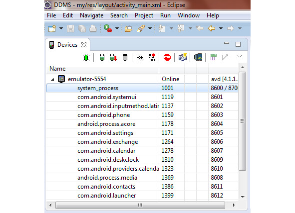 Представление Devices отображает подключенные Android-устройства. Для каждого подключенного Android-устройства Devices-представление показывает все запущенные на нем процессы, каждый из которых работает в своем экземпляре виртуальной машины Dalvik. Каждый отображаемый процесс представляет инсталлированное и запущенное на Android-устройстве приложение, поэтому идентификация процесса производится по имени пакета приложения. Так как виртуальная машина Dalvik работает поверх ядра Linux, каждый процесс имеет свой Linux-идентификатор, отображаемый в окне Devices после имени пакета. Крайний правый столбец окна Devices показывает номер порта, который DDMS-инструмент назначает для подсоединения Eclipse-отладчика к экземпляру Dalvik-машины с использованием протокола JDWP (Java Debug Wire Protocol). По умолчанию Eclipse-отладчик подсоединяется к статическому порту 8700, на который перенаправляются трафики экземпляров Dalvik-машины от всех портов. DDMS-инструмент взаимодействует с подключенным Android-устройством с помощью инструмента Android Debug Bridge (adb), имеющего клиент-серверную архитектуру. DDMS-инструмент создает adb-клиента, который взаимодействует с adb-демоном (фоновый процесс, работающий в Android-устройстве) через adb-сервер.