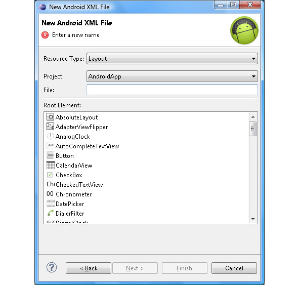 Раздел Root Element: мастера создания Layout-файла предлагает выбрать корневой View-компонент GUI-интерфейса, который может быть как контейнером для других GUI-компонентов, так и отдельным GUI-компонентом.