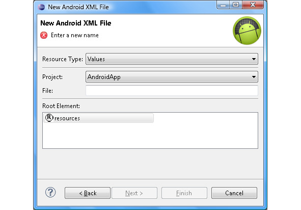 Поле File: мастера создания ресурсного файла предлагает ввести имя нового файла XML-описания значений приложения, который затем с расширением. xml появится в каталоге res/values Android-проекта и будет доступен в Java-коде с помощью сгенерированного R-класса или в XML-коде с помощью ссылки на имя ресурса.