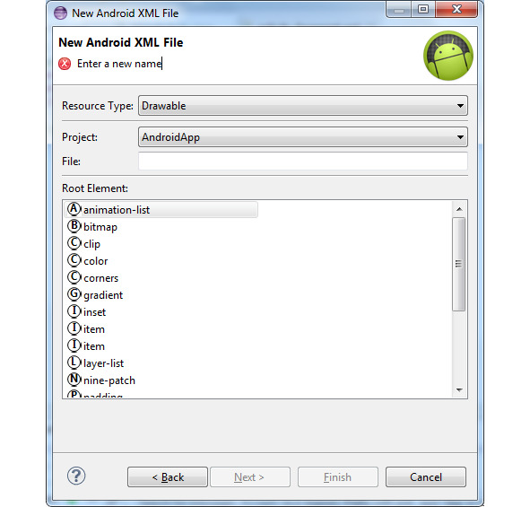 Для создания графического ресурса Android-приложения в окне Project Explorer нажмем правой кнопкой мышки на узле проекта и в контекстном меню выберем команду New | Other | Android | Android XML File, нажмем кнопку Next – в результате откроется окно мастера, в списке Resource Type которого выберем тип Drawable.
