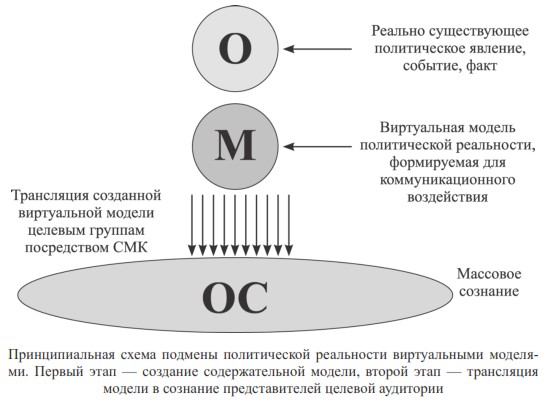Средства массовой коммуникации стали практически единственным источником отражения и интерпретации политических событий и явлений, формируя информационную повестку дня и определяя степень общественной значимости тех или иных фактов и событий в сфере политики. При этом объективные факты, которые не вписываются в формируемую псевдореальность, исключаются из трансляции и не находят своего отражения в массовом сознании.