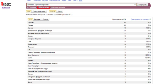 Даже если ваш сайт соответствует требованиям Яндекса, то может возникнуть проблема непопулярности товаров/услуг в нужном регионе. Чтобы предотвратить эти проблемы, воспользуйтесь инструментом [битая ссылка] Яндекс. Вордстат. Для прогноза региональной популярности достаточно ввести интересующий запрос и отметить поле «по регионам»: