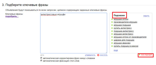 Затем в окне «Ключевые слова» задаем «коммерческие» запросы – ключевики со словом «купить», «заказать», «цена» и др. В поле справа всплывают подсказки. Можете выбрать подходящие, нажав на эти слова.