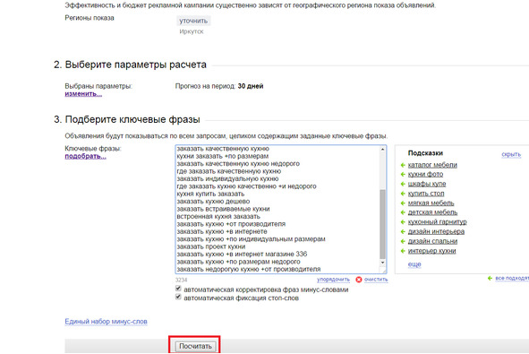 Все подходящие ключевые слова скопируйте в Прогноз бюджета и нажмите на кнопку «Посчитать»: