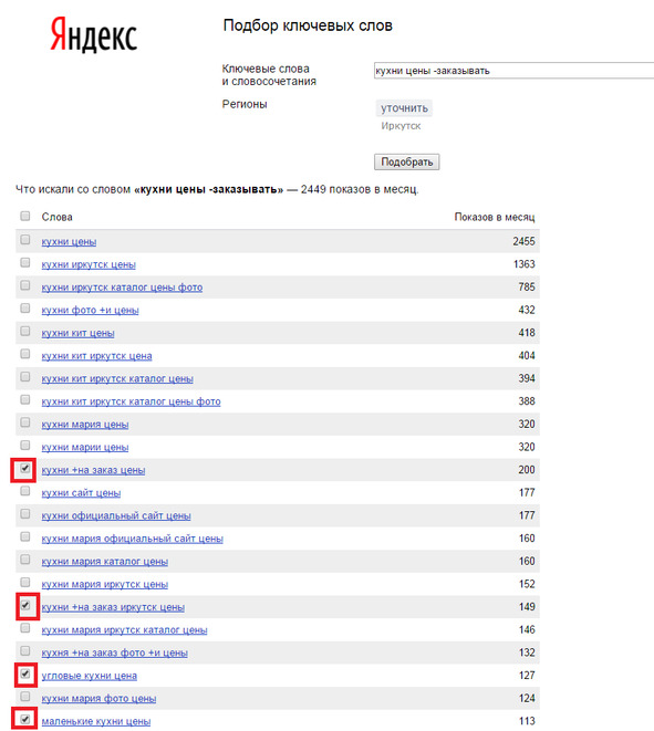 Для того чтобы исключить нецелевые запросы, в левом углу ставим «галочку» только рядом с теми ключевыми словами, которые вам подходят. Показы по остальным запросам не будут учтены.