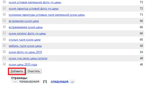 Откроется дополнительное окно, где можно посмотреть, какие поисковые запросы входят в ключевое слово кухни цены.