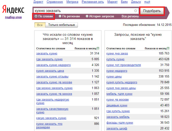 Если возникли проблемы, пользуемся «подбором слов» [битая ссылка] Яндекс. Вордстат: отмечаем радиокнопку «по словам», вводим нужное ключевое слово и кликаем на кнопку «Подобрать».