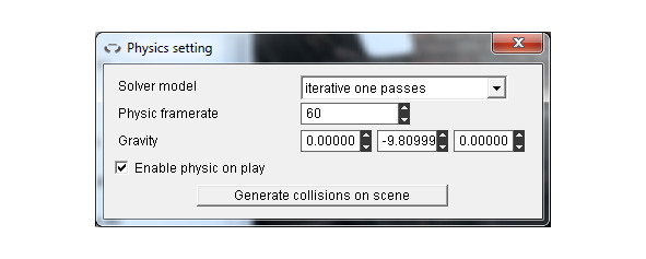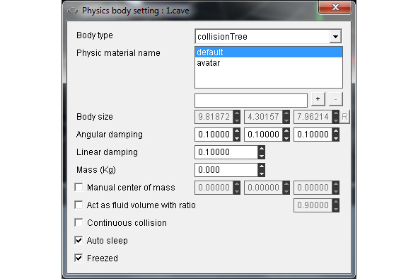Чтобы придать реальность объекту, в его свойствах выберем Set physic, выберем объекту форму shape и установим его массу, при этом в узле cave сцены должна быть установлена форма collisionTree. Если отмечен флажок Freezed, тогда физика объекта будет ожидать столкновения, перед тем как заработать.