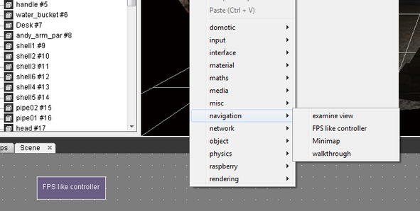 FPS like Controller PlugIT можно подключить, нажав правой кнопкой мышки в зоне редактирования функций вкладки Scene и выбрав navigation/FPS like controller. Удалить компонент можно кнопкой Delete клавиатуры.