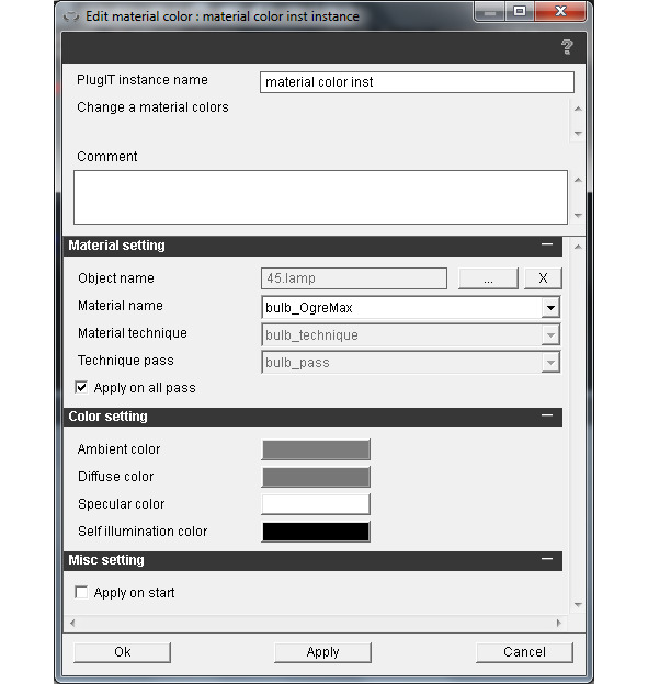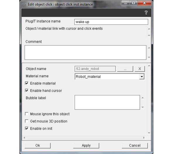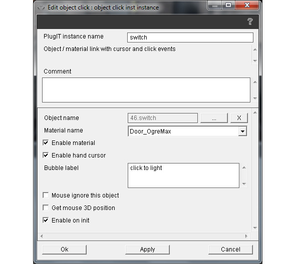 Нажмем правой кнопкой мышки на зоне редактирования функций и выберем object/object click. Присвоим имя switch экземпляру PlugIT. В поле Object name свяжем экземпляр PlugIT с объектом switch дерева сцены. Отметим флажок Enable hand cursor. В поле Bubble label введем click to light и нажмем Ok.