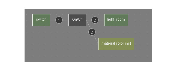 Нажмем правой кнопкой мышки на экземпляре On/Off и выберем Out1, свяжем его с экземпляром material color, выбрав Enable. Нажмем правой кнопкой мышки на экземпляре On/Off и выберем Out2, свяжем его с экземпляром material color, выбрав Disable.