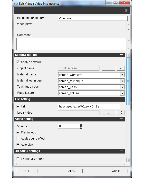 Сделаем так, чтобы на телевизоре сцены проигрывалось видео. Для этого нажмем правой кнопкой мышки на зоне редактирования функций и выберем media/Video. Отметим флажок Apply on texture и свяжем этот экземпляр с объектом oldscreen. В поле Url введем ссылку. Отметим флажок Auto play и Play in loop, в поле Volume поставим 0, уберем флажок Transparency.