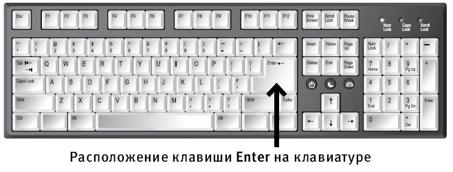 Клавиша Enter (энтер) расположена с правой стороны от кнопок с буквами. На некоторых клавиатурах на клавише не обозначено название, а нарисована только стрелка, согнутая под прямым углом. Это одна из основных кнопок, используемых при любой работе на компьютере.