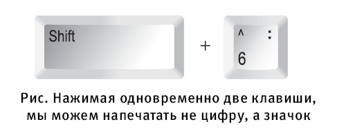 Например, при помощи одной клавиши «6:» можно напечатать и цифру 6, и двоеточие. Для того чтобы напечатать двоеточие, а не цифру, необходимо одновременно с клавишей «6:» нажать клавишу Shift.