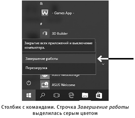 6. Найдите строчку: Завершение работы. Подведите курсор к этой строке, и она выделится серым цветом.