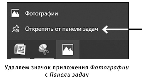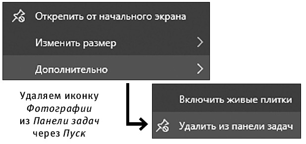 2. Нажмите правой клавишей мыши на квадратик Фотографии и выберите: Дополнительно – Удалить из панели задач.