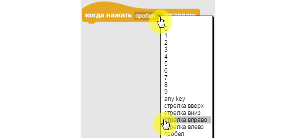 Для того чтобы изменить управляющую клавишу в блоке когда нажать пробел клавишу кликните на маленький треугольничек выпадающего списка и выберите стрелку вправо.