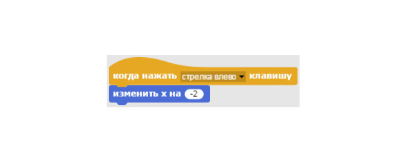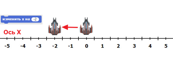 При изменении координаты Х на отрицательное значение, спрайт переместится влево. На следующем рисунке показан результат работы блока изменить Х на -2.