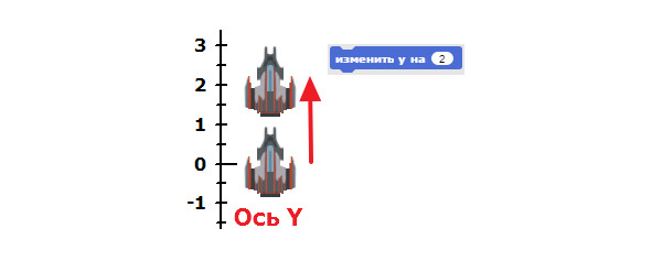 Для перемещения спрайтов по вертикали нужно изменять координату Y. На следующем рисунке показан результат работы блока изменить Y на 2.