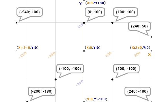 На рисунке показана координатная сетка Snap4Arduino с координатами различных точек. Как видите, в правой половине сцены координата Х всегда больше ноля, и наоборот, в левой половине сцены она меньше ноля. Координата Y больше ноля в верхней половине сцены, и меньше ноля в нижней.